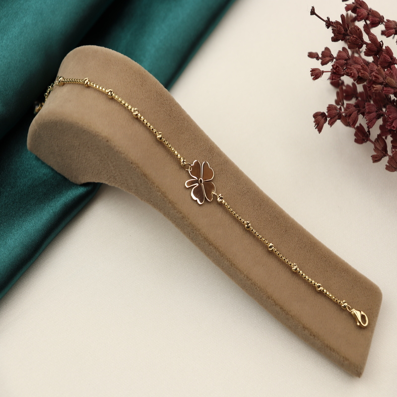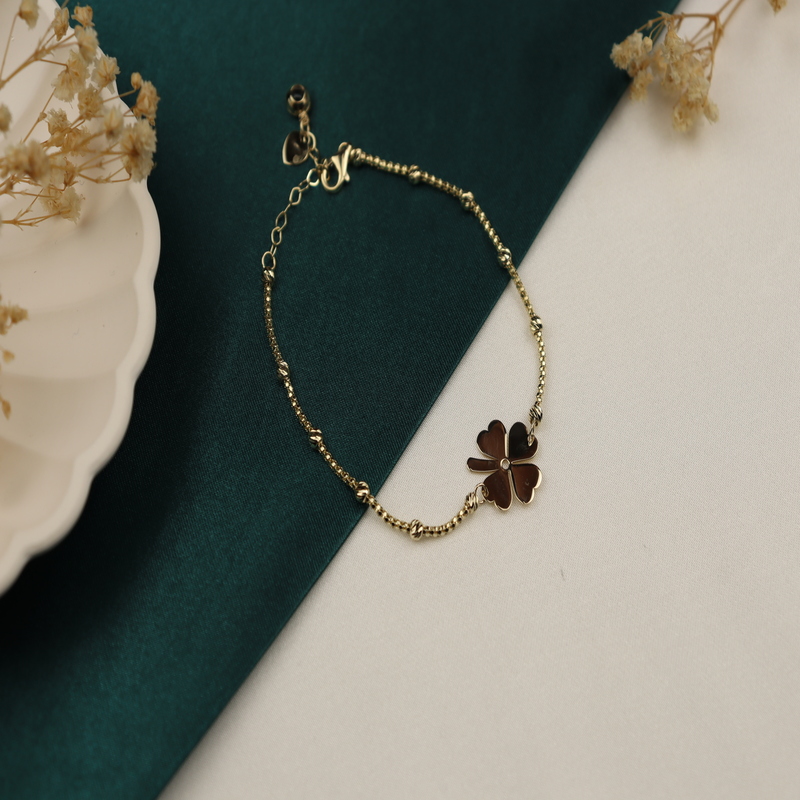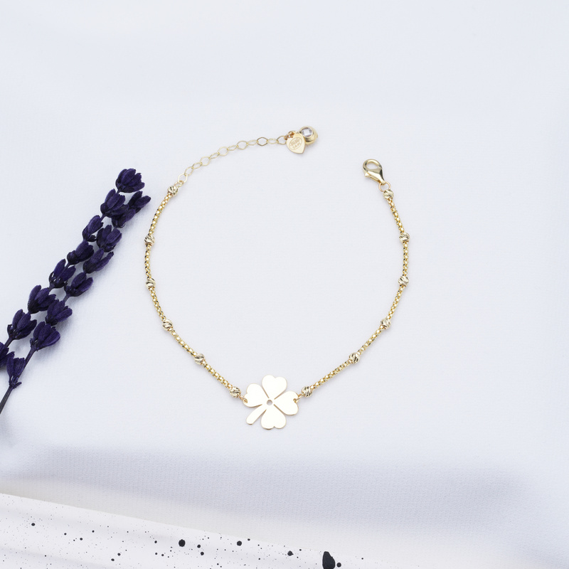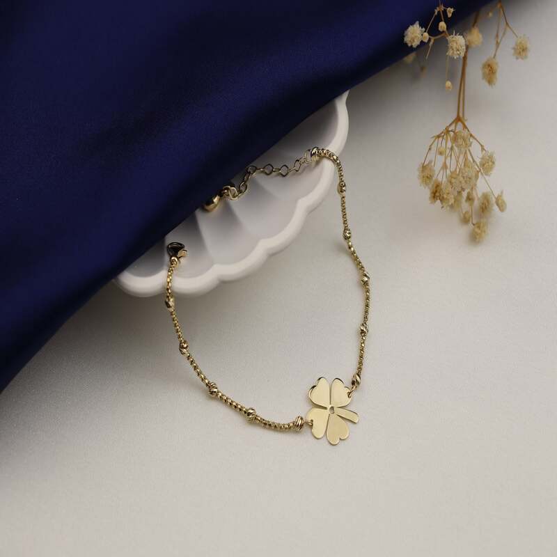 Altının eşsiz ışıltısını taşıyan bu şans bilekliği, sevdiklerinize anlamlı bir hediye seçeneği sunarken, zarafetiyle de göz kamaştırır. Yonca figürü, bolluk ve şansı simgelerken, bilekliğin şık tasarımı modern ve klasik tarzlara uyum sağlar.