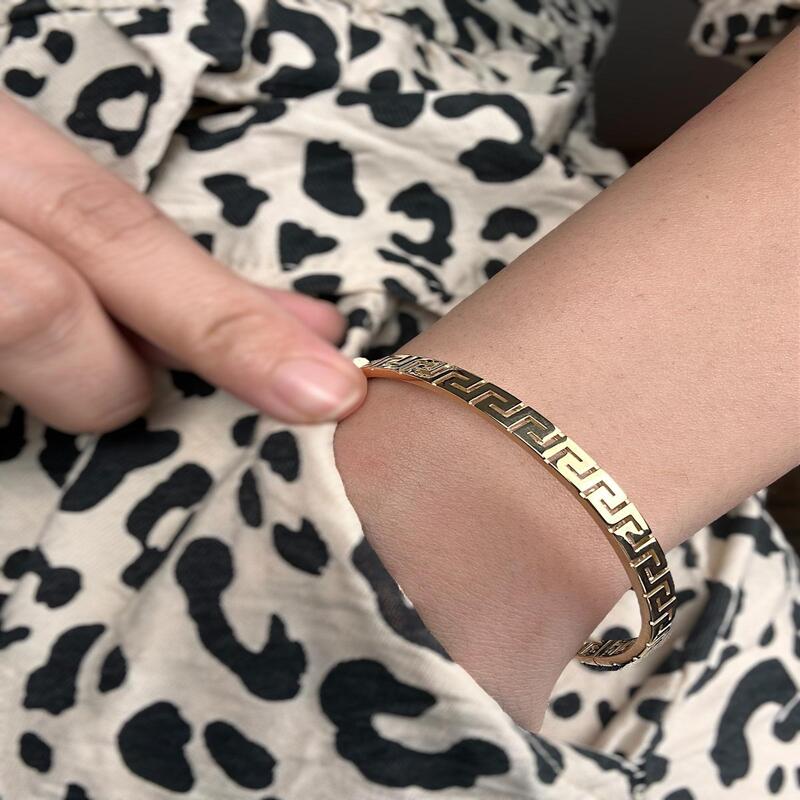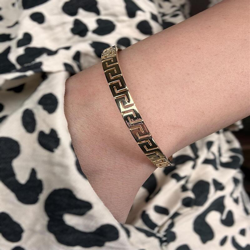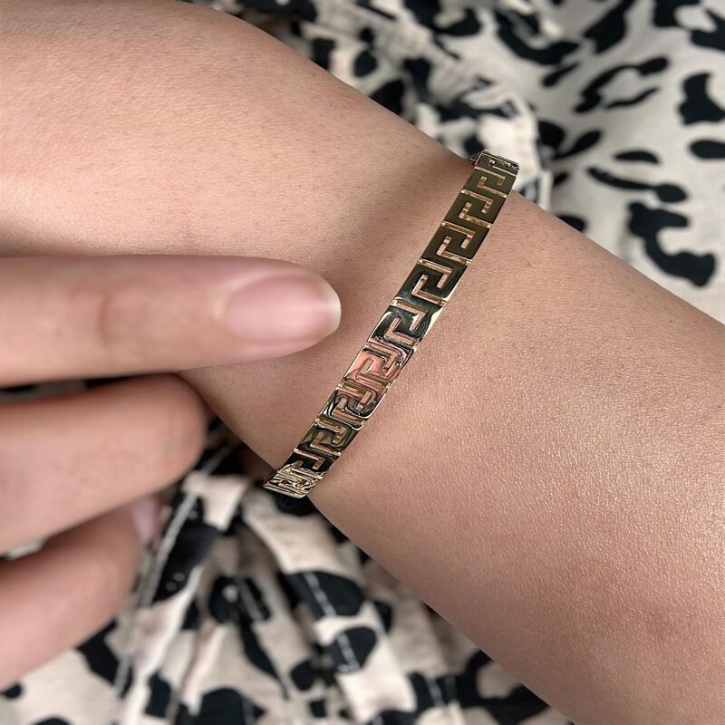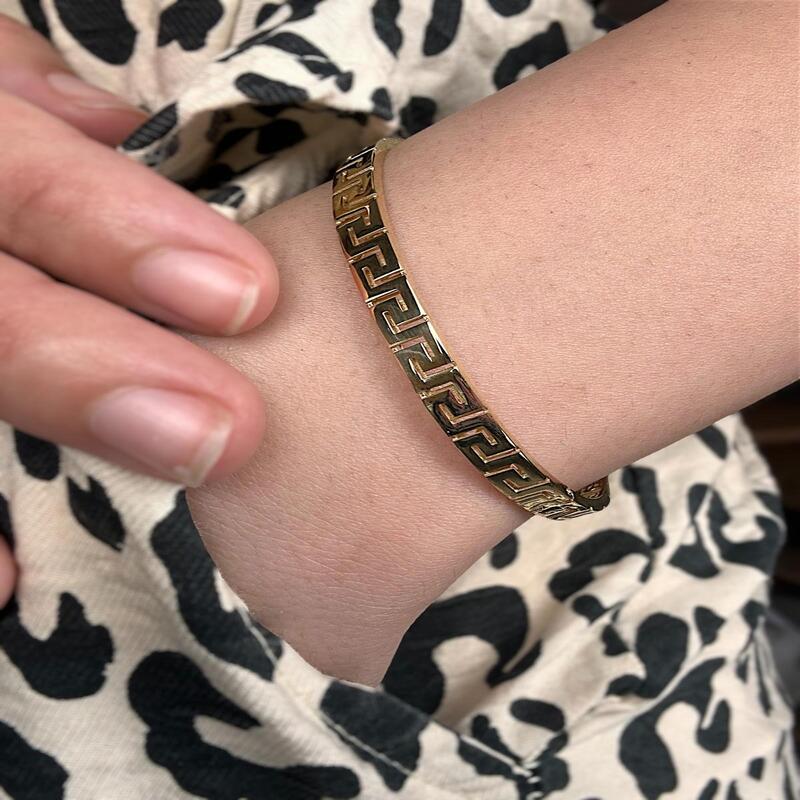Grek (Yunan) motifli bu 14 ayar altın kelepçe bileklik, 8.36 gram ağırlığıyla zarif bir görünüm sunarken sağlam yapısıyla da uzun ömürlü kullanım sağlar.