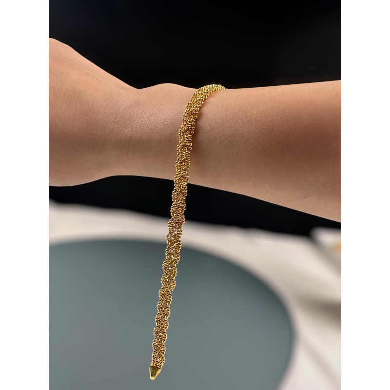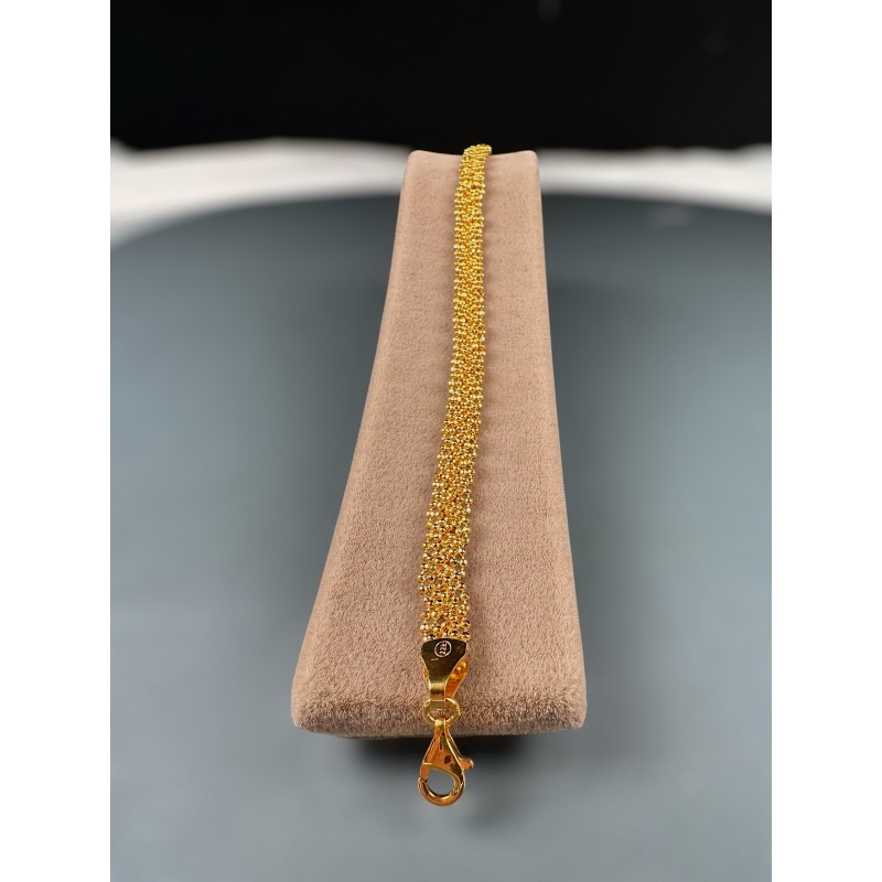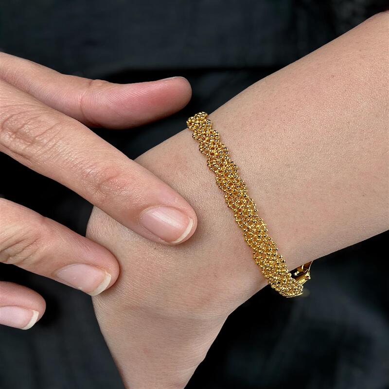 Zarafetin ve el işçiliğinin buluştuğu bu 22 ayar altın bileklik, 10.14 gram ağırlığı ile hem estetik hem de yatırım amaçlı tercih edilebilecek eşsiz bir takıdır. Top model dokulu yüzeyi, klasik bilekliklere göre daha dikkat çekici ve modern bir görünüm sunar. Günlük hayatta sade şıklığınızı tamamlarken, özel davetlerde zarafetinizi ön plana çıkarır. Faturalı, sertifikalı ve özel kutusunda gönderilen bu değerli parça, hem kendiniz hem de sevdikleriniz için harika bir seçimdir.