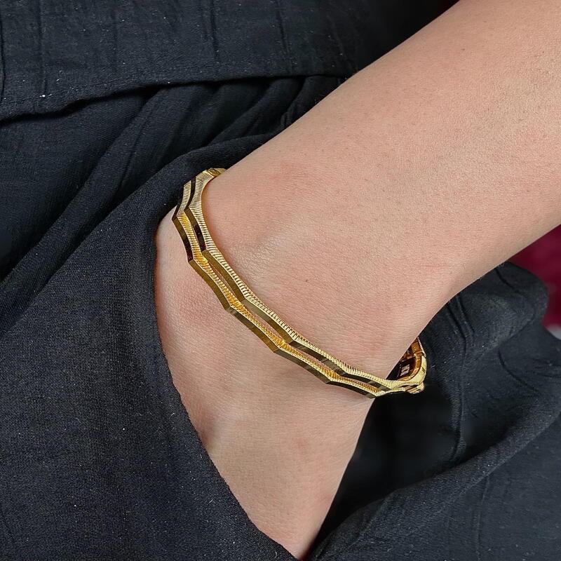 Stil sahibi kadınların tercihi olan bu geometrik detaylı altın bileklik, 14 ayar kalitesiyle uzun ömürlü kullanım sunar. 8.18 gram ağırlığıyla bileğinizde varlığını hissettiren bu özel tasarım, sade kombinlere zarif bir ışıltı katmak için idealdir. Kendinize ya da sevdiklerinize şık bir hediye alternatifi arıyorsanız doğru yerdesiniz.