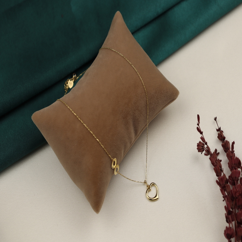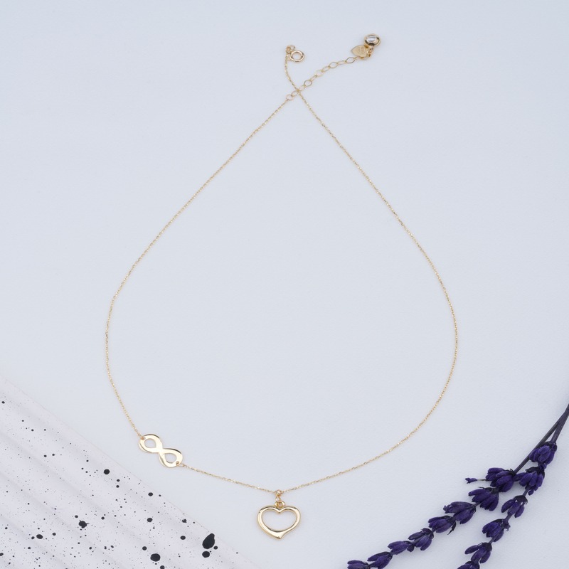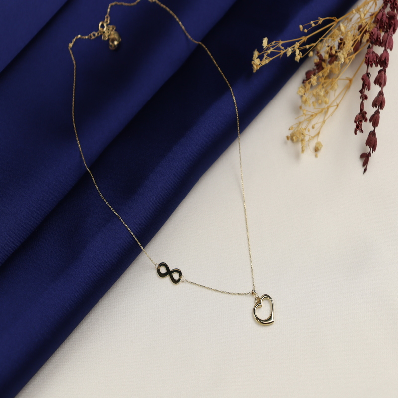 Bu zarif ve şık 14 ayar altın kolye, sonsuzluk ve kalp motifleri ile lazer kesim detaylarıyla dikkat çekiyor.2.52 gram ağırlığında olan bu özel tasarım, 43 cm uzunluğunda ve 3.5 cm baklava uzatma zinciriyle kullanım rahatlığı sağlar. 0.20 forse kesim ve fermuar kilit detayıyla estetik ve güvenliği bir arada sunar. Hem günlük kullanımda hem de özel anlarda stilinizi tamamlayacak bu kolye, sevdiklerinize anlam dolu bir hediye seçeneği olabilir.