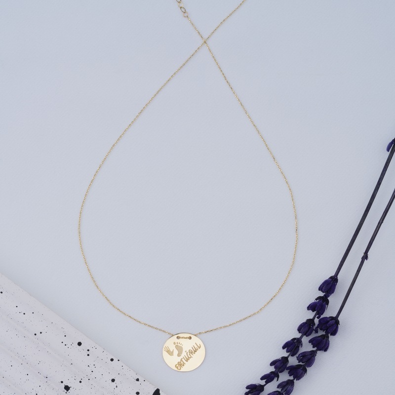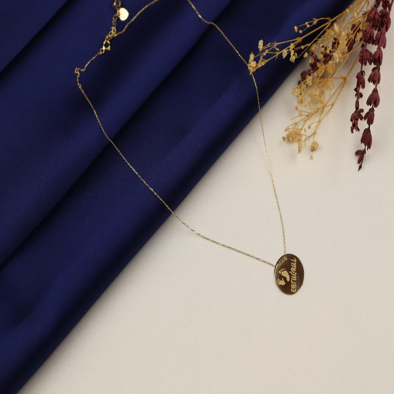"Kişiye özel tasarlanan 14 ayar altın kolye, zarif ve şık tasarımıyla öne çıkıyor. 2.60 gram ağırlığında olan bu kolye, 585 ayar altından üretilmiş olup, 43 cm uzunlukta ve 3.5 cm baklava uzatma detayıyla rahat bir kullanım sunar. Özel isim kazıma ve plaka çapı 1.8 cm olan bu kolye, sevdiklerinize anlamlı bir hediye olarak ideal seçimdir."
