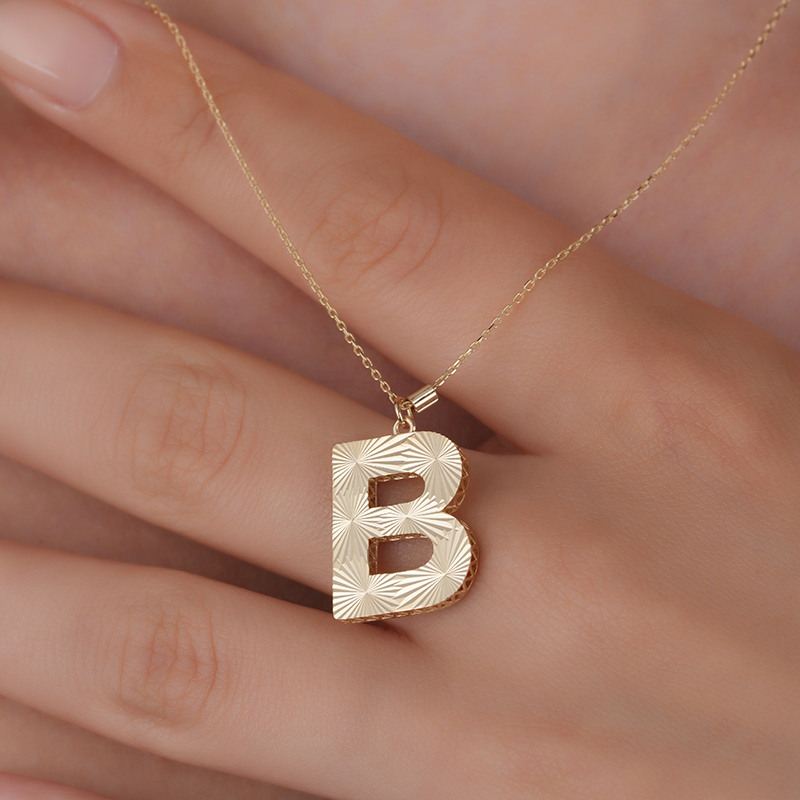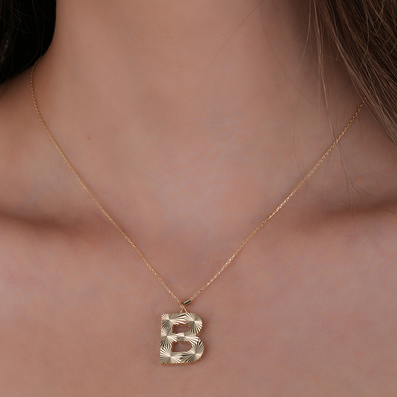 "14 ayar altın harf kolye, zarif ve şık tasarımıyla stilinizi tamamlıyor. Kişiye özel B harfi detaylı kolye, günlük kullanıma uygun hafif yapısıyla hem modern hem de anlam dolu bir hediye seçeneği sunuyor."